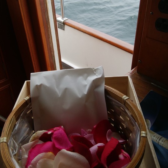 ご遺骨は粉末加工し海水に溶ける袋に包んで献花用の花びらを添えて散骨します。