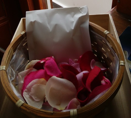 当社にご遺骨の粉末化をご用命頂いた際には、ご遺骨は「海に溶ける水溶性の袋に小分けして包む」準備をします。当日に船上より献花用の「花びら」と献酒をサービスさせていただきます。